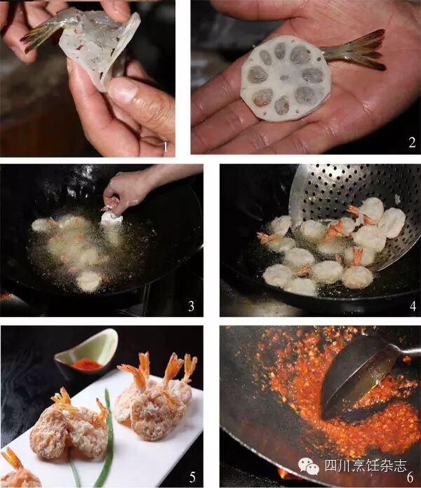 先把虾肉捶成泥,入碗调味搅匀后,酿入藕夹,待逐一拍匀干淀粉后,下热油锅里炸酥,捞出来装盘并淋鱼香味汁。这种成菜方式,也是川菜厨师常用的一种手法。在虾泥里添加其他原料,也可换外面用来包裹夹制的原料,还可调成其他味型,从而演绎出更多的虾肴。