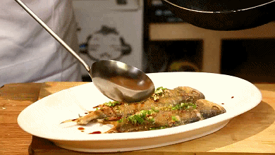5·浇油:把葱姜末放在鱼身上,用热油滋香葱姜。香喷喷的黄花鱼即可上桌啦~