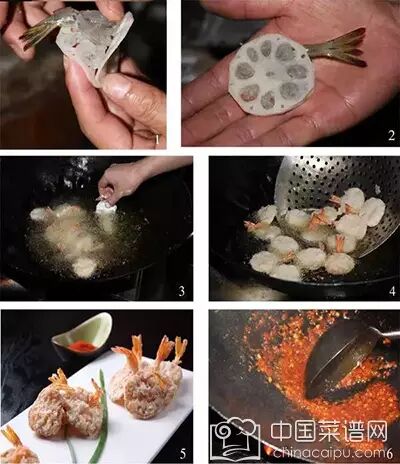 2.依据上述做菜的方法并加以变化,还可做出别样风味的虾肴。第一,可在虾泥当中加菌菇类的颗粒、马蹄粒等以增加口感;第二,可把藕夹换成面包片、馒头片、土豆夹等;第三,可在藕夹外面再粘匀一层面包糠,使得成菜口感更酥脆;第四,味汁还可调成酸辣味、鲜辣味、家常味、酱香味等。