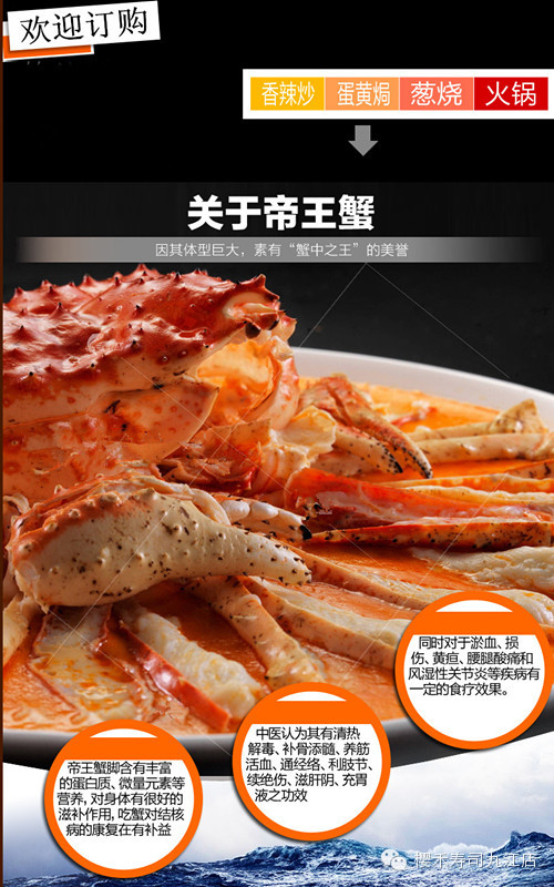 【帝王蟹】生长在南极海域下200公尺-300公尺之间活动,属性寒带的海水中、其有耐冰冷,更因生长形状独特,全身布满刺状、而在海中并无天敌可言!其鲜甜美的帝王蟹,其体型庞大,堪称蟹中之王,是蟹中极品,故有「帝王」之名。本店严选肥美帝王蟹,让您享受帝王蟹的鲜美好味道!