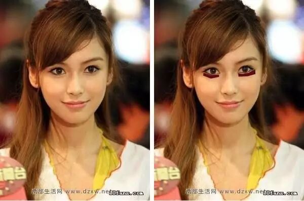 上图左,眉眼间距较开,无卧蚕,眉毛短。上图右,眉眼间距较近,有卧蚕,眉毛长。从视觉感受来说,右边面部内容更加丰富一些,眉毛与卧蚕其实起到了增加眼睛面积的作用。这就是,为什么我们感觉有些人眼睛特别大,有些人眼睛会小一些的原因。长眉毛又使脸从视觉上变窄。