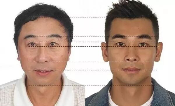通过辅助线,我们会发现,面部五官的比例,遵循三庭五眼原则。左右两人,脸部面积几乎一样。