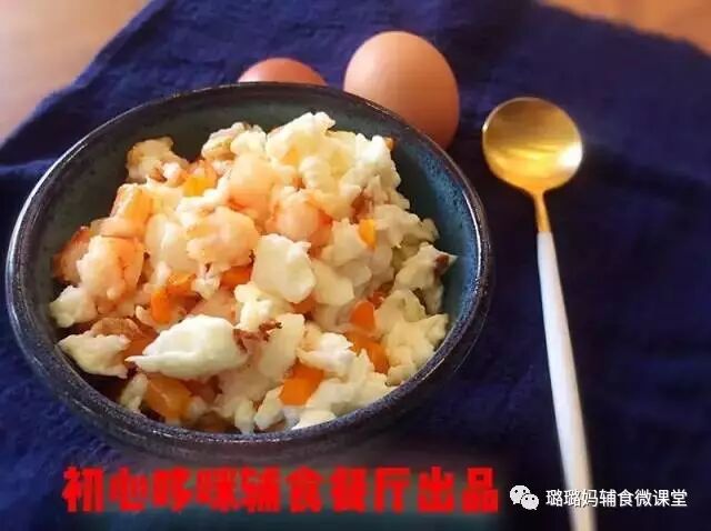 虾2只,鸡蛋1个, 牛奶30Ml,生粉3g, 胡萝卜粒少许
