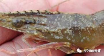 对虾白斑综合征是由白斑综合征病毒感染引起。病虾一般停止摄食,行动迟钝、体弱,弹跳无力,漫游于水面或伏在池边、池底不动,出现死亡。病虾体色往往轻度变红或暗红,部分虾体的体色也不会改变。发病初期可在头胸甲上见到针尖样大小白色斑点。并且可见对虾肠胃还充满食物,头胸甲不易剥离。病情严重的虾体较软,白色斑点扩大甚至连成片状。有严重者全身都有白斑,有部分虾伴肌肉发白,肠胃没有食物,手挤压能挤出黄色液体,头胸甲易剥离。病虾的肝胰脏肿大,颜色变淡且有糜烂现象,血凝时间长,甚至不凝。