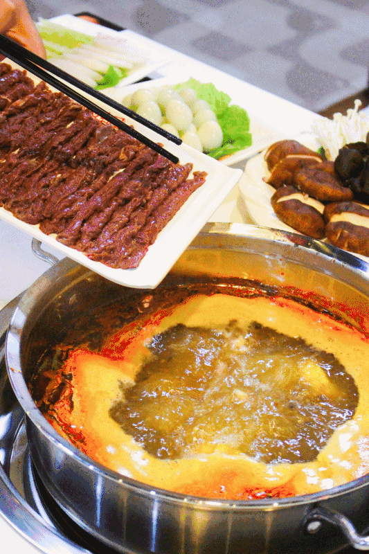 等汤面开始咕噜咕噜的翻滚,就可以开涮啦!先下它个半盘鲜牛肉,耐心等待煮熟然后通通干掉