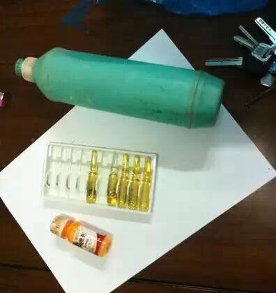 民警在这两名男子的机动三轮车上发现了6支密封的小型针管药剂、1个桔黄色药剂瓶,以及一个清洁剂瓶。