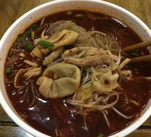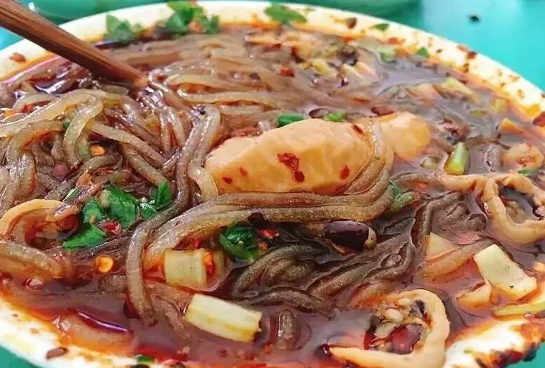 他们家的粉子透明有韧性,料下得也很足,浮满了辣油,猪肠被洗得干干净净,建议小伙伴们一个肥肠节子和粉,再加上一个锅盔搭配起吃,这三样简直就是黄金搭档,味道简直巴适惨了。