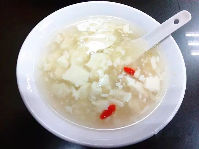 冰醉豆花,其实也没有很冰,接近常温。甜甜的,带着酒酿的酸,豆花有种特别淡但香甜的豆奶味,香浓又有一种甜美的口感。