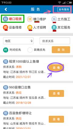 4.这时可以查看塘口出租、塘口维护、人才招聘等其他版块。同时右上角可以点击发布服务,发布您的供应信息。