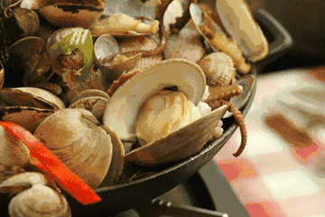 一点水也不加,干锅煮,开锅不多会儿就能听到‘啪啪’开口的声音,不要打开锅盖,等个三分钟到五分钟,这样做出来的蚬子肉很嫩。