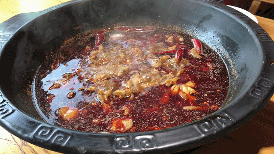 麻辣牛蛙锅底分量十足,让沸腾的牛油和红辣椒和牛蛙来一次完美接触,Q弹爽嫩的蛙肉完全被麻辣的味道浸透,只有现点现杀的牛蛙才能如此新鲜。