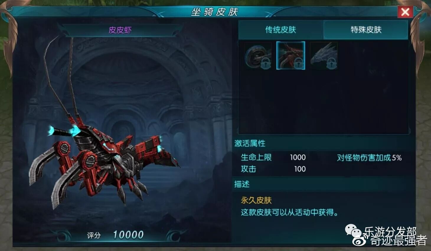 本次游戏更新,新增了特殊坐骑皮肤:炫酷机车、皮皮虾