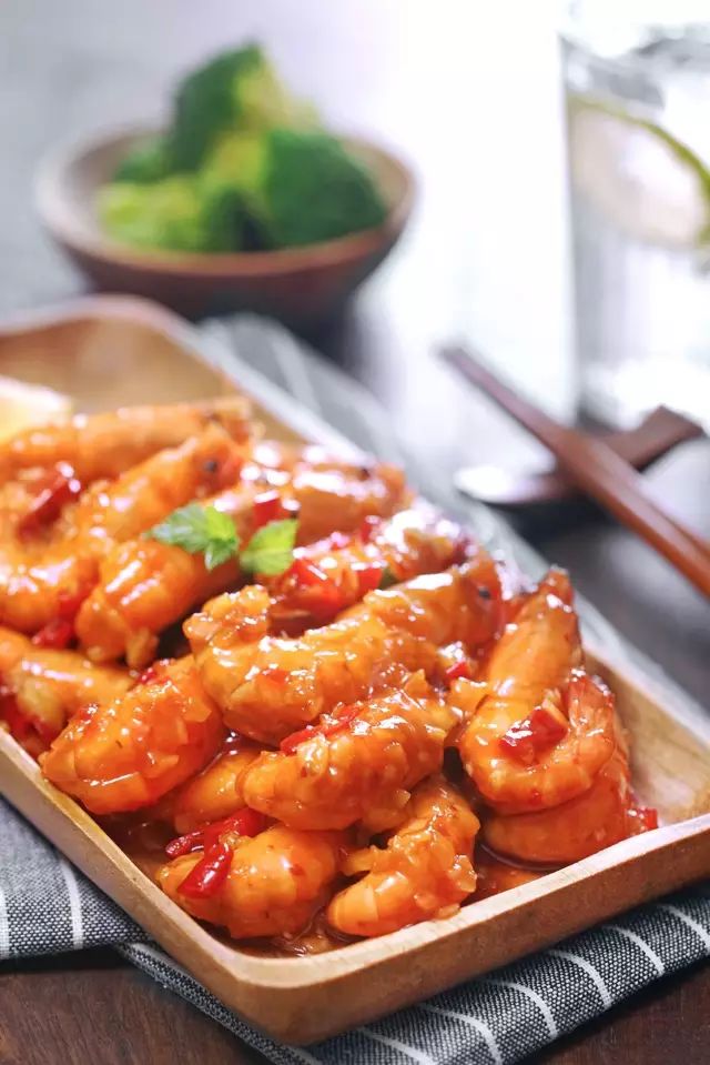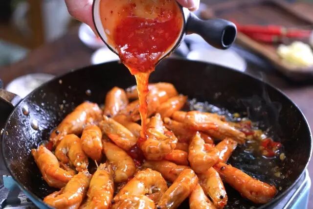 4、倒入三大勺泰式酸辣酱、柠檬醋、少许蚝油和料酒,拌匀炒熟。