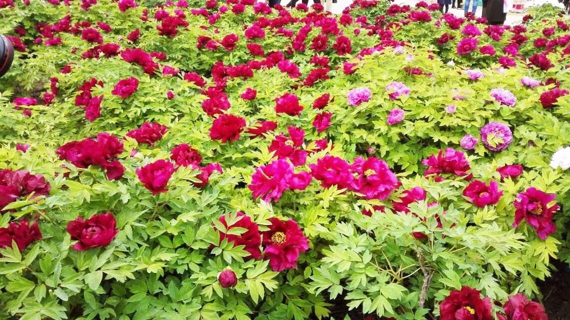 全园约有85个品种1.8万株牡丹开放。人工调控花期牡丹有赵粉、明星、粉中冠、雪映桃花等品种成片盛开;露地自然花期彩绘、丛中笑、黑海撒金等品种初开。