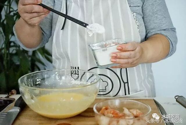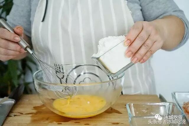 鸡蛋打散,加入玉米淀粉、白胡椒粉、盐、橄榄油(或玉米油)、高度白酒,