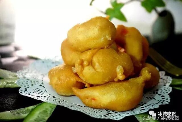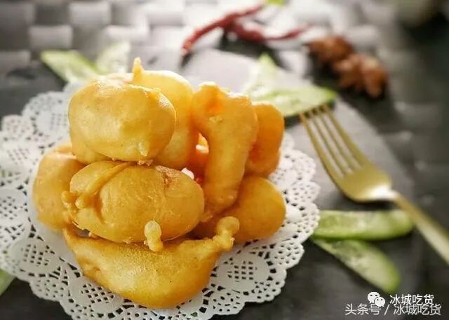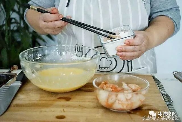 腌制好的虾段先在干玉米淀粉里蘸一下,再去裹满蛋糊,这样下锅炸的时候不会脱糊。