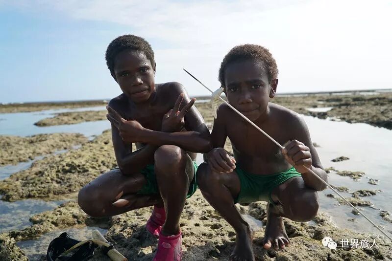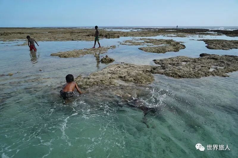 有一天,我跟光哥去塔纳的海边溜达,看见当地的男孩子在潜水捉鱼烤来吃。孩子们看见我们,围过来显摆他们的战利品。这一片海,近岸就是大片的浅海珊瑚。退潮之后,在珊瑚浅滩上就形成了许多水沟,基本都不超过一米深,许多小鱼就隐藏在水沟里,成为了孩子们的水上乐园和渔猎练习地。水坑很浅,都没有大鱼,孩子们的渔获大多是指头大小的小鱼。