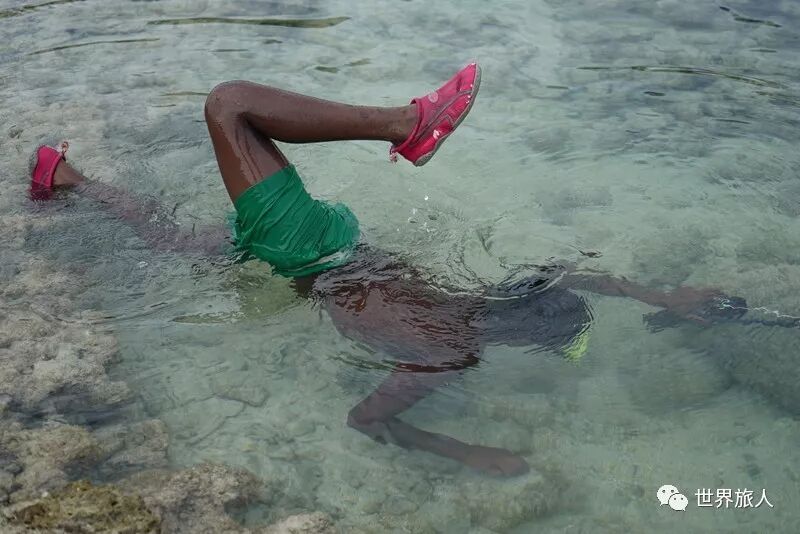 一个男孩子从水里冒出来,一手拿着鱼叉,一手抱着个扁头大虾,向我们跑过来,惊呼:“DapaDapa!”