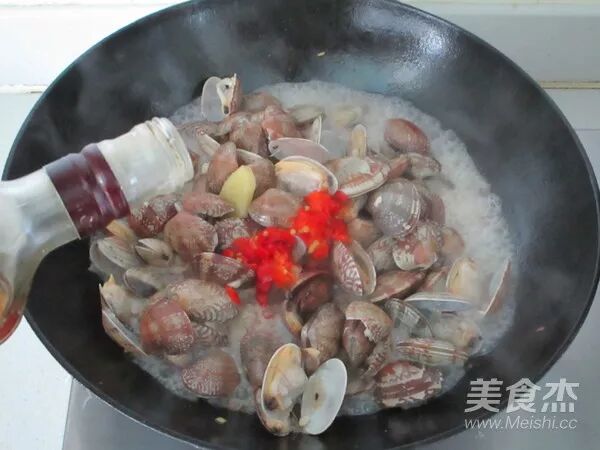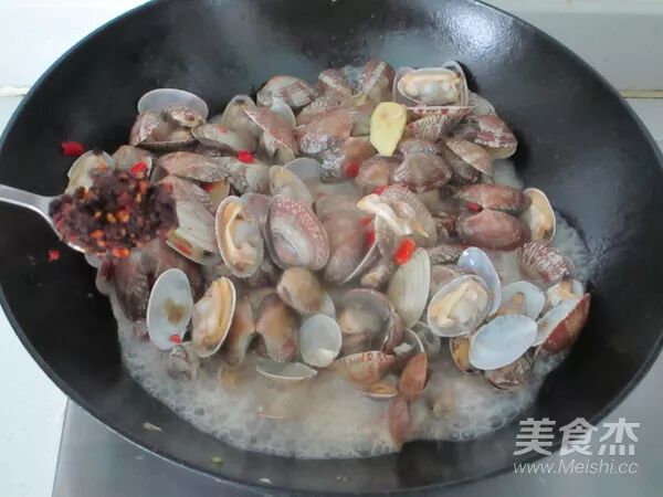 等蛤蜊口全部开口后倒入剁椒,再烹入黄酒