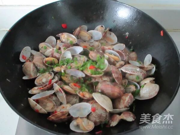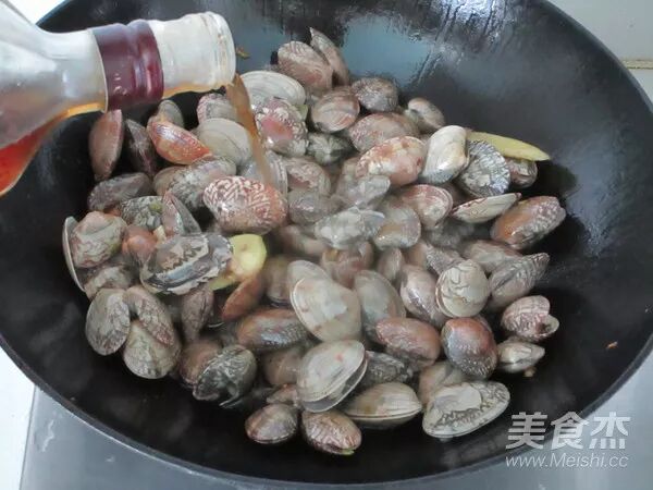 炒至蛤蜊微微的开口后烹入少许黄酒