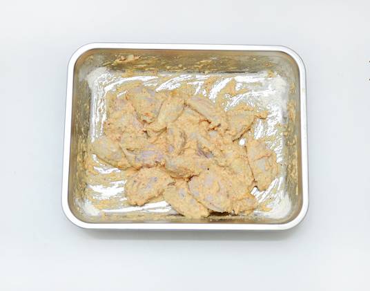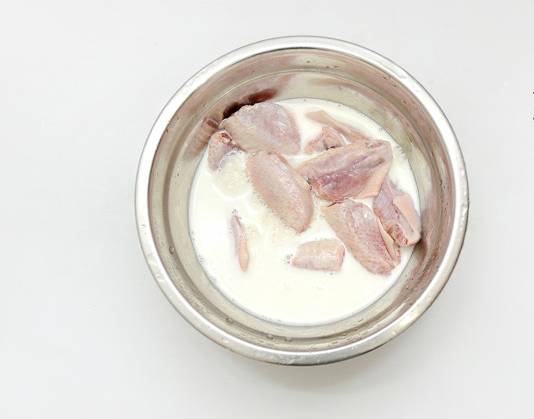 ① 将鸡翅中冲洗后放入牛奶中浸泡,可去除异味;再次用流水冲洗,擦干,将鸡肉腌料均匀涂抹在鸡肉上,静置1小时;