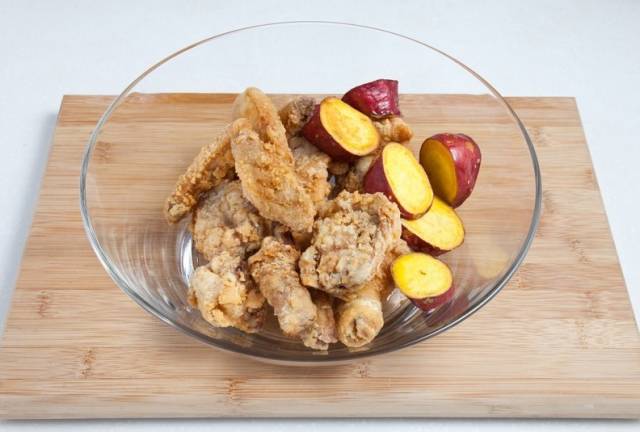 ③ 腌好的鸡肉均匀裹上面粉,下170℃油锅里炸制两次,炸好后用厨房纸吸去浮油;用剩下的油浆红薯也炸至金黄色。