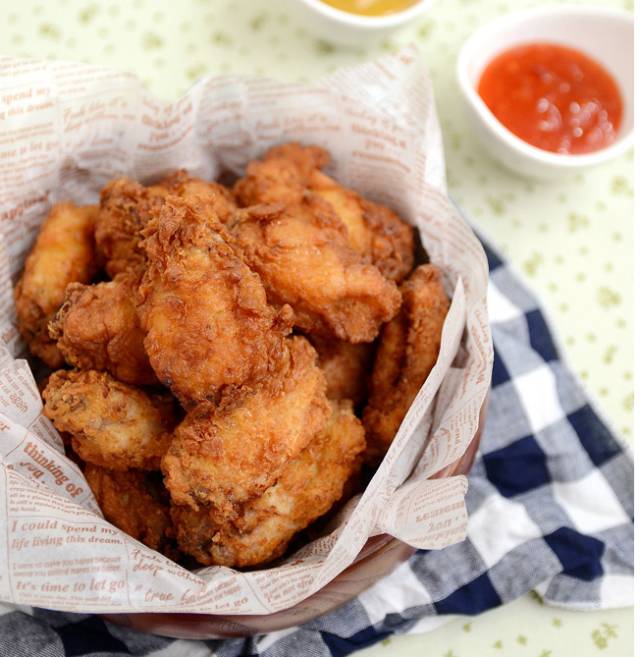 ④ 油温加热到170℃时放入鸡肉,炸两次(先炸制表面微黄,捞出,再放入炸第二次,至表面金黄);
