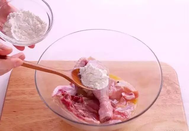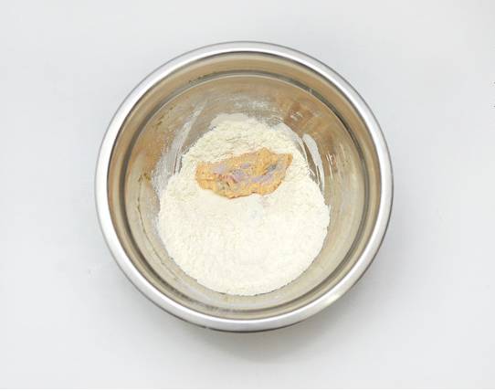 ② 将腌好的鸡肉均匀地沾上一层面粉;调好面糊,将裹上面粉的鸡翅放入;
