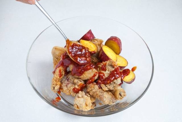 ④ 将调味汁均匀地浇在炸鸡和红薯上,最后撒点芝麻,开吃。