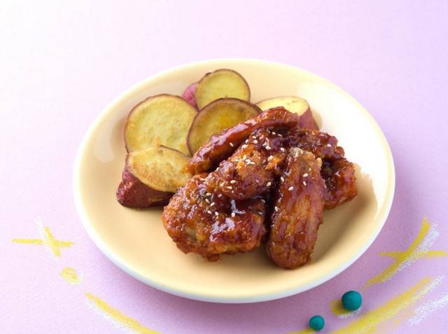 ① 鸡肉切块洗净,擦干水分,涂上腌料,静置30分钟左右;同时洗净并擦干红薯,切成方便食用的大小;