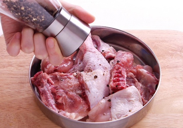 ① 将腌料均匀涂抹在用冲洗过的鸡肉上;