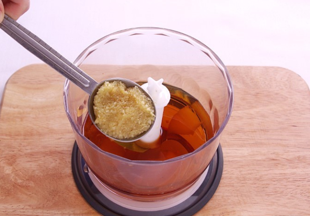 ⑤ 将蒜汁材料混合后,加热至浓稠,放凉后将其浇在炸鸡上即可。