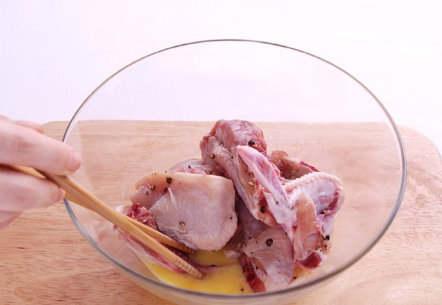 ② 将鸡蛋打散在碗中,并与腌制好的鸡肉拌匀;