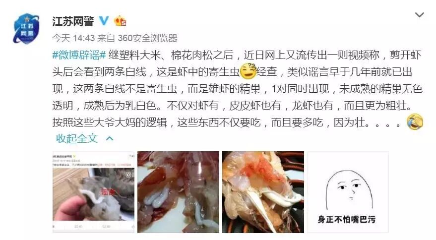近日,江苏省公安厅网络安全保卫总队官方微博“@江苏网警”对此发布辟谣微博称:“经查,类似谣言早于几年前就已出现,这两条白线不是寄生虫,而是雄虾的精巢,一对同时出现,未成熟的精巢无色透明,成熟后为乳白色。不仅对虾有,皮皮虾也有,龙虾也有,而且更为粗壮。”