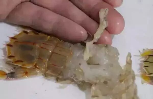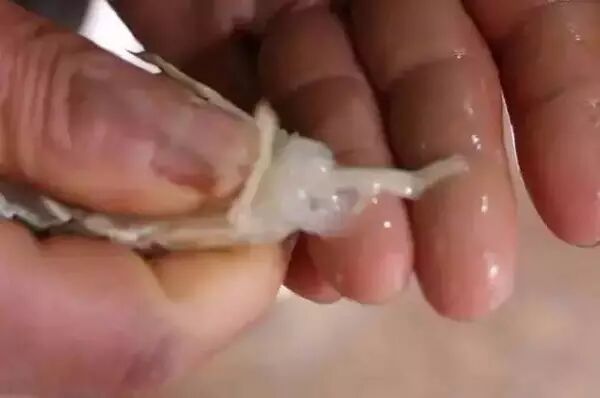 被挤出“精巢”的皮皮虾(“皮皮虾长出寄生虫”谣言视频截图)