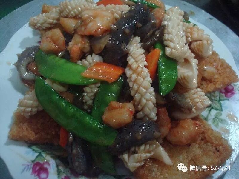 2、油锅中炒香葱屑,倒入荷兰豆、胡萝卜、虾仁、鱿鱼花加盖煮4分钟,鱼排垫底摆盘,淋下勾芡即可。