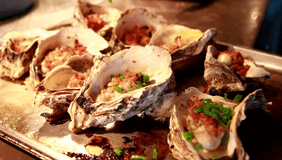 超大个儿的生蚝、蒸扇贝、秋刀鱼