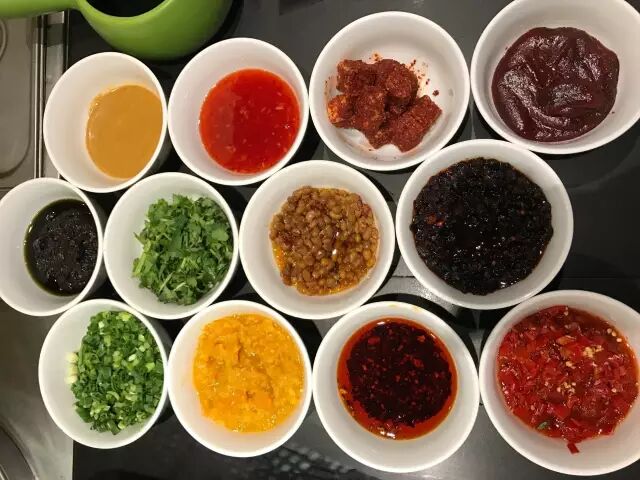 面档上摆满了各种调料,你想吃什么风味的都可以!