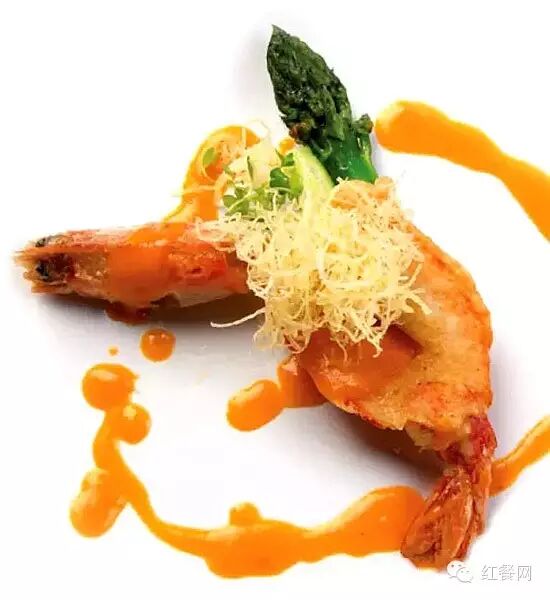 4、腌制过的红虾擦干水分,表面弹生粉,放入锅中用黄油煎熟装盘,锅中倒入打好的汁水,加李锦记幼滑虾酱、盐、味粉、鸡精烧开后用水淀粉勾芡,将芡汁淋在红虾上,用事先准备好的土豆松及芦笋做盘饰。