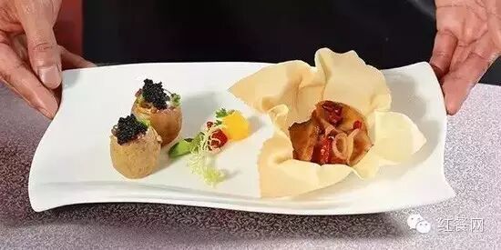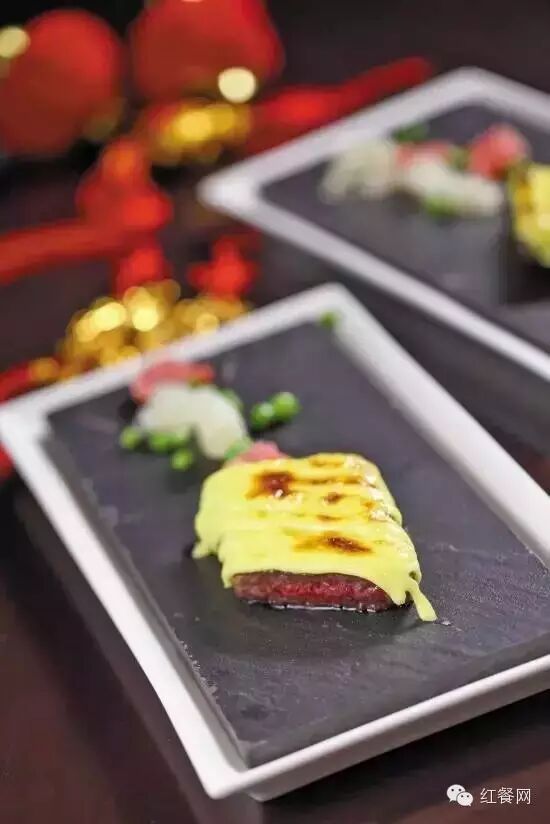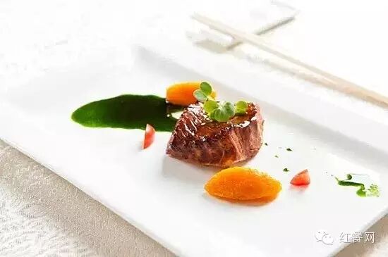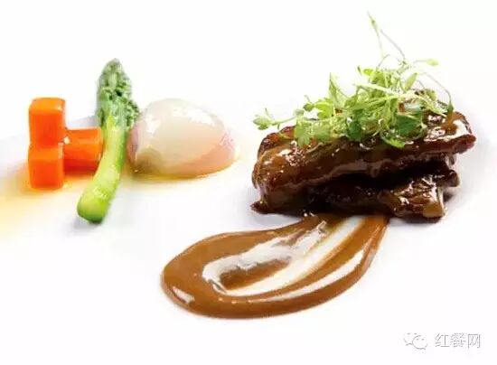 2、牛肋骨用叉烧酱、排骨酱腌制12小时以上,入烤箱以150℃烤2小时,取出后改刀成0.8厘米厚的片,以洋葱圈、苦菊垫底,码放在木板上,淋黑椒汁,放上炸好的茨菰片,配黑椒汁、番茄沙司即可。