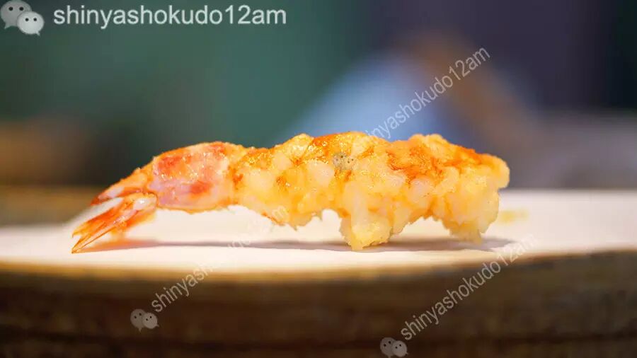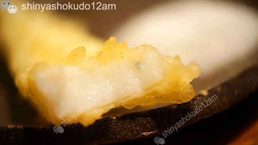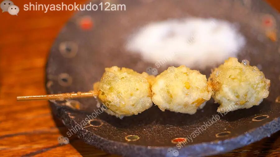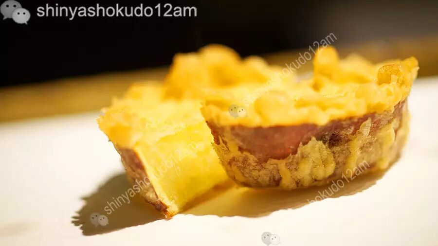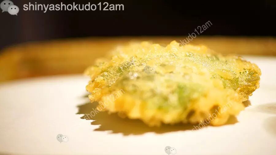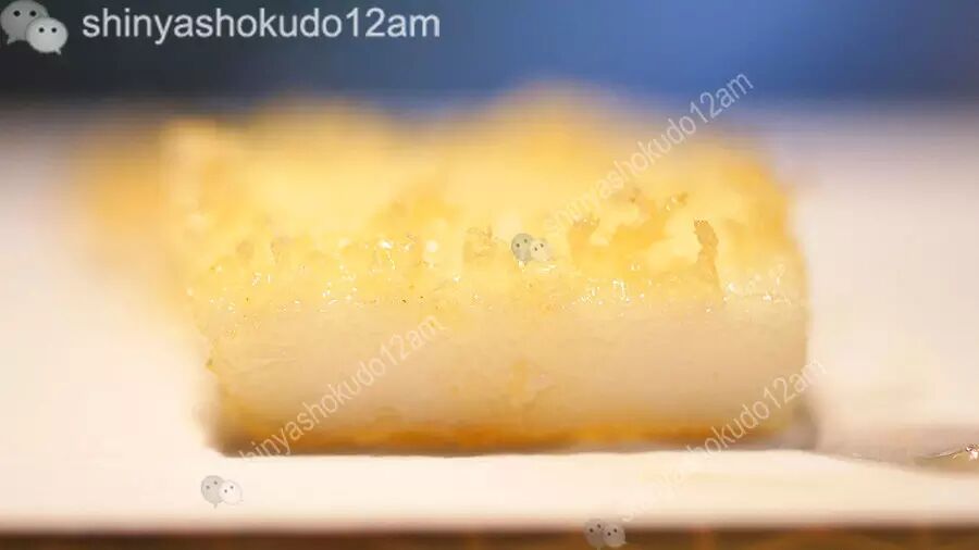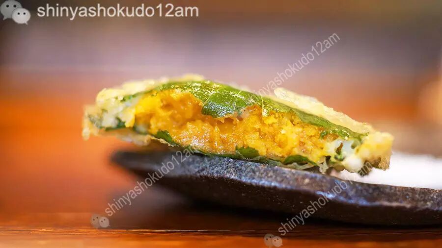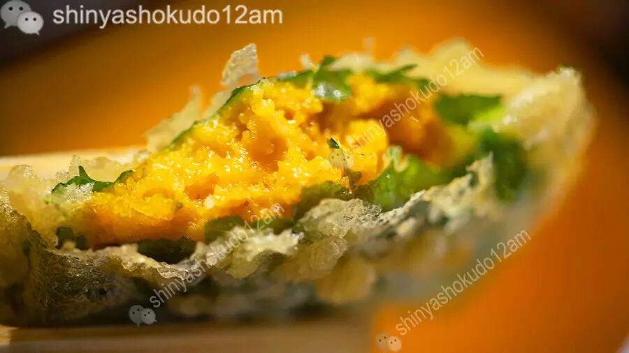 被视为难度极级的炸海胆,用的是北海道利尻海胆,用两片紫苏叶包里可定形,炸好之后半分不腻,海胆清甜无比。