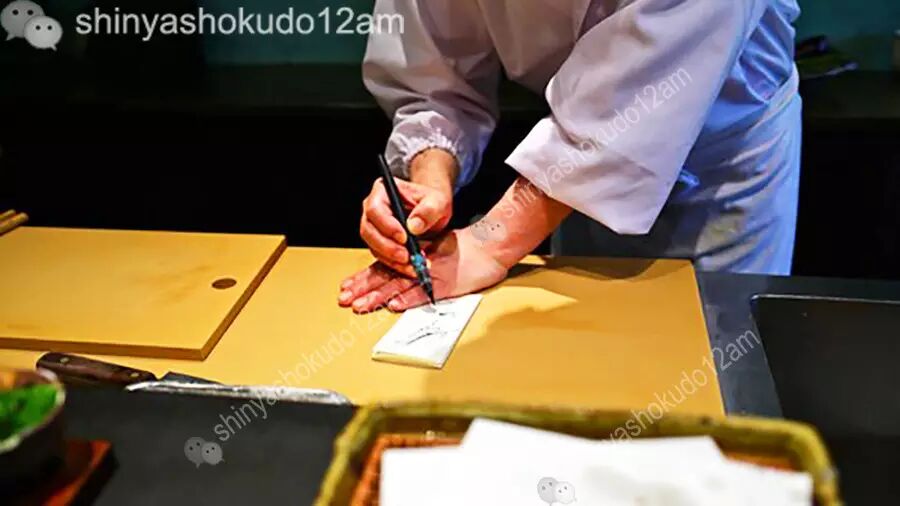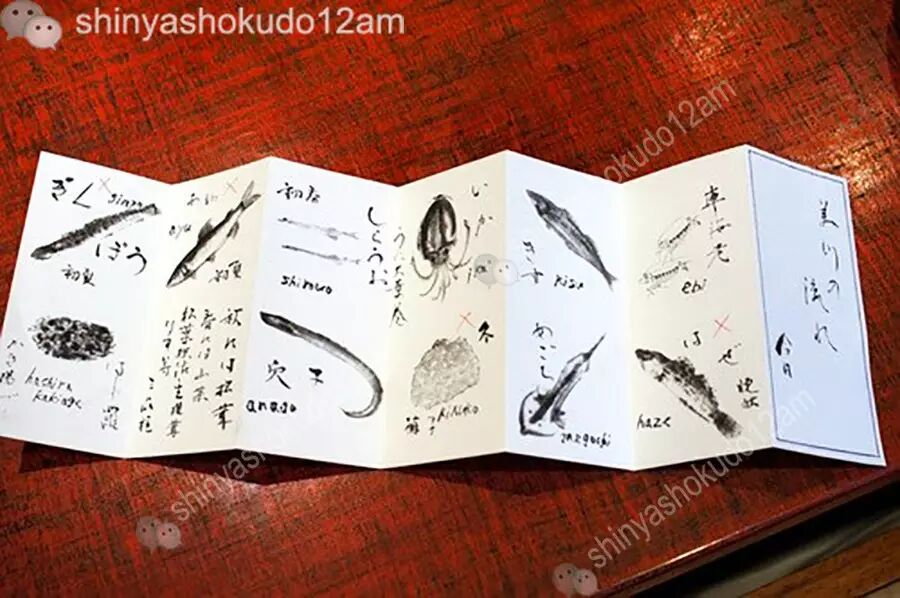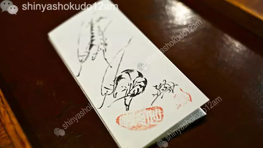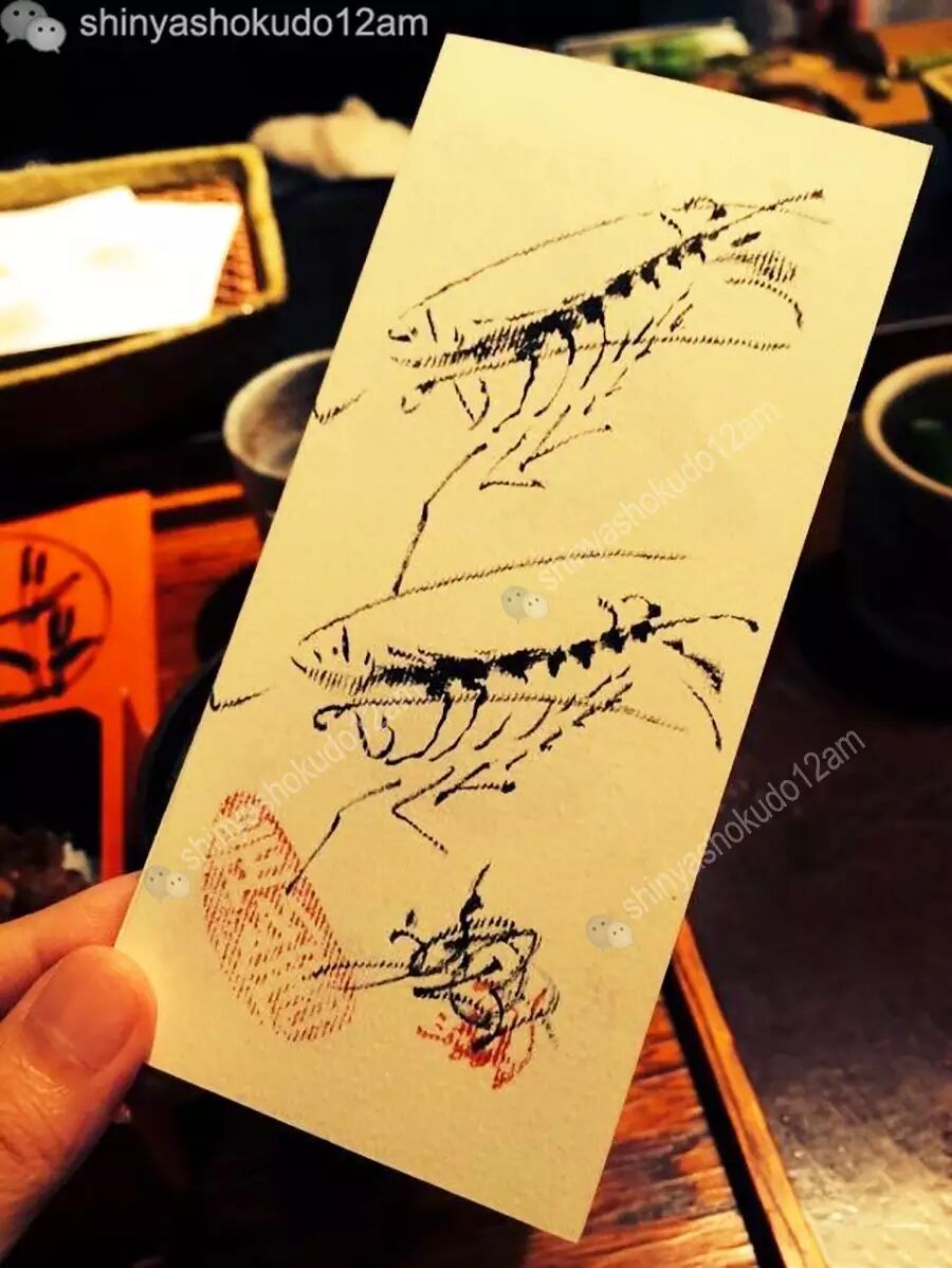 餐后,早乙女师傅会主动在菜单上作图加签名,以兹留念。为客人画虾时早乙女师傅表情分外轻松,仿佛是他在紧张工作中的闲情逸致~~