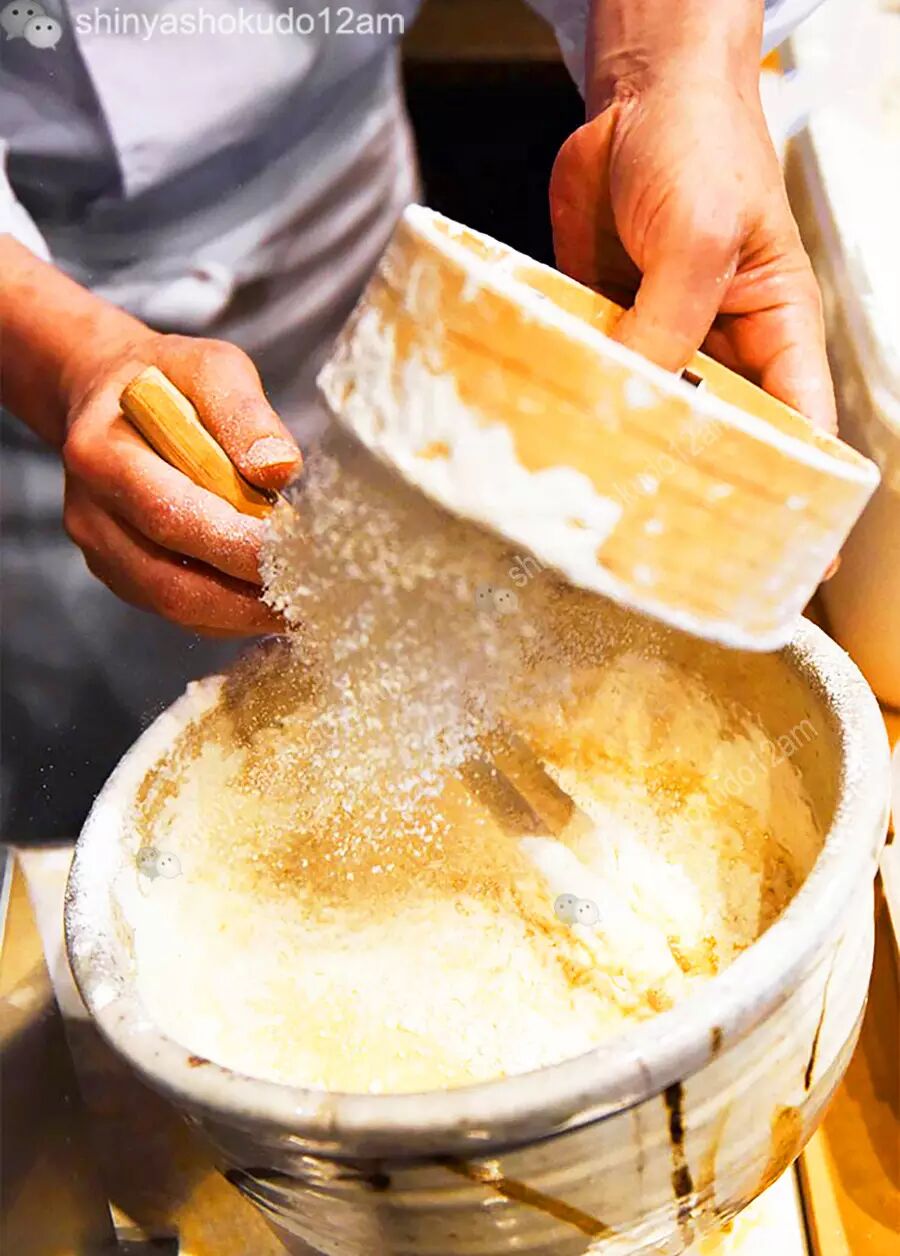 经过五十多年的锤炼,炸过近三千万个天妇罗,他的大脑早已锻炼成精密的计算机,油温200℃,虾炸23秒,虾肉保持45℃,面衣的比例、厚度……这些精确的数字,诠释着“天妇罗科学家”的美名。