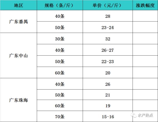 地区  | 规格 (尾/斤)  | 本周价格 (元/斤)  | 上周价格 (元/斤)  | 环比幅度 (↗→↘)  |