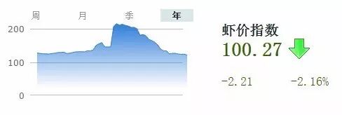 2016年8月10日,中国虾价指数收报100.27点,较上一统计日(8月3日)下调2.21点,跌幅2.16%,全国塘头虾价平均20.74元/斤(40支/斤,下同),环比下调0.46元/斤。