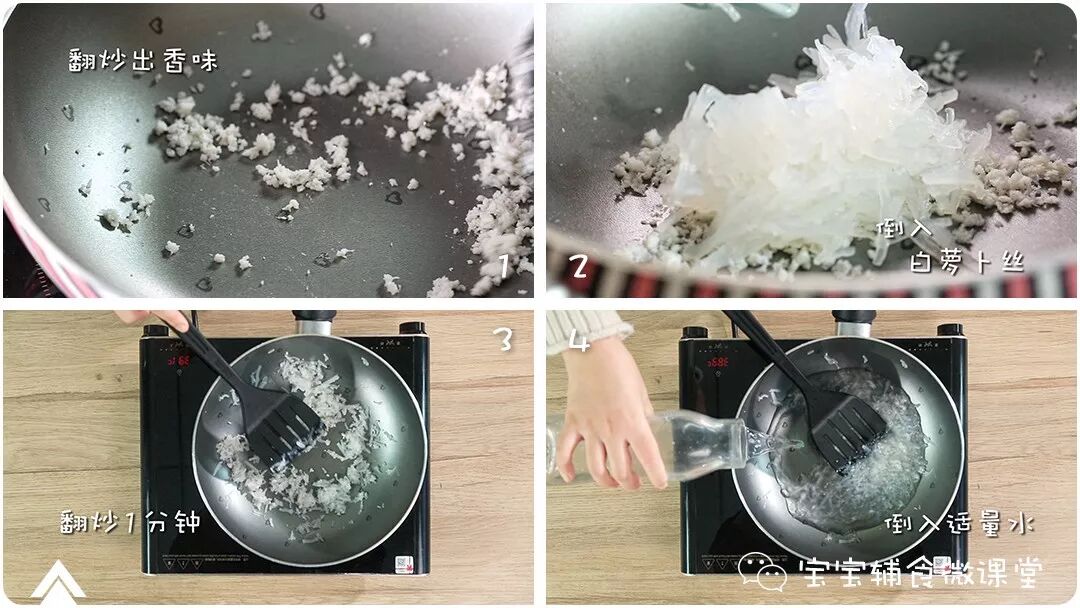 先倒入银鱼炒出香味,再倒入白萝卜丝翻炒一分钟,最后加入适量水,盖上锅盖焖煮。