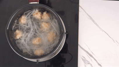 5.刚才煮虾丸的水烧开,放入姜片、萝卜丝,沸腾后下虾丸,小火慢煮10分钟
