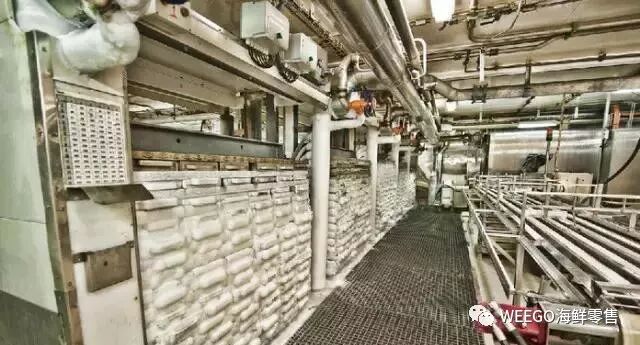 加工好的北极虾被整齐地摆放在船舱中的冷库内,等待返航。