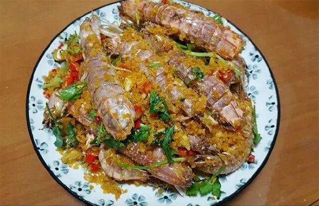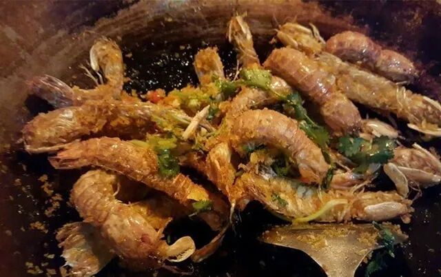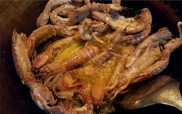 倒入炸好的皮皮虾,撒椒盐,喷点生抽,炒匀