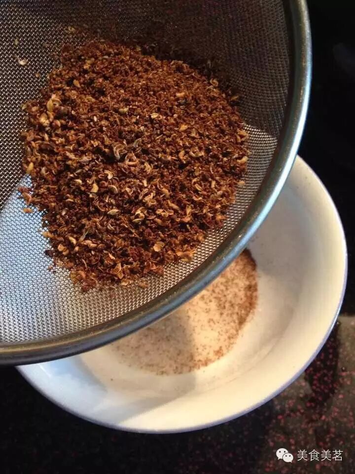 2、将花椒擂碎,和盐一起过筛,椒盐就做成了。